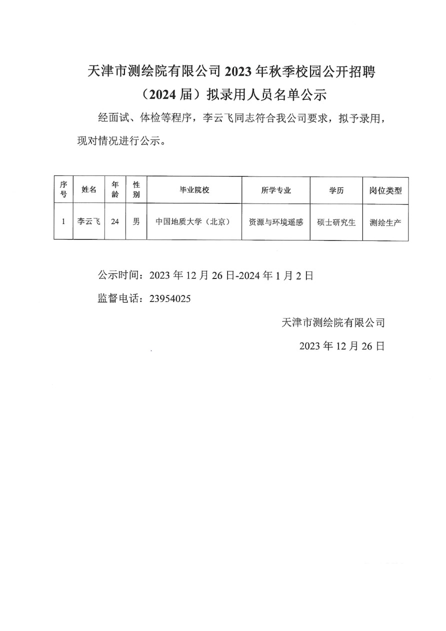 天津市測繪院有限公司2023年秋季校園公開招聘(2024屆)擬錄用人員名單公示 2023-12-26